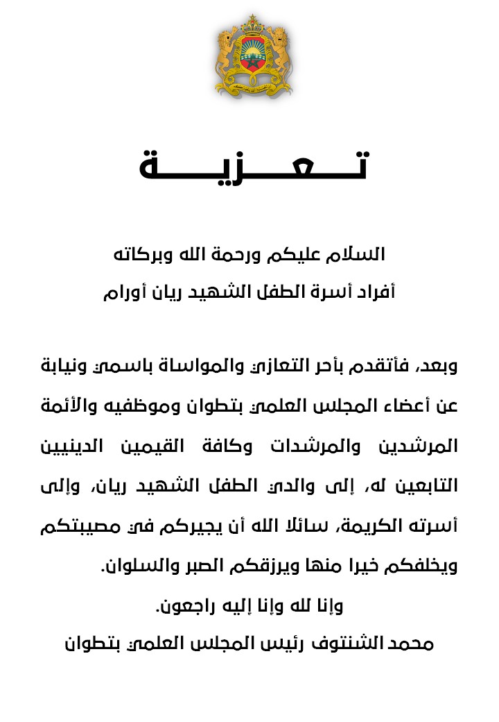 أخبار المجلس العلميأنشطة المجلس العلمي تعزية المجلس العلمي لأسرة الطفل الشهيد ريان أورام بواسطة mohammed said في فبراير 6, 2022 283 شارك 283 شارك FacebookTwitterGoogle+ReddItWhatsAppPinterestالبريد الإلكتروني