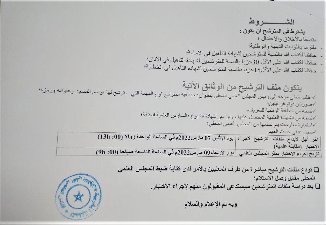 أخبار المجلس العلميأنشطة المجلس العلمي إعلان الترشيح لمزاولة المهمة أو المهام الدينية… بواسطة mohammed said آخر تحديث فبراير 28, 2022 282 شارك 282 شارك FacebookTwitterGoogle+ReddItWhatsAppPinterestالبريد الإلكتروني
