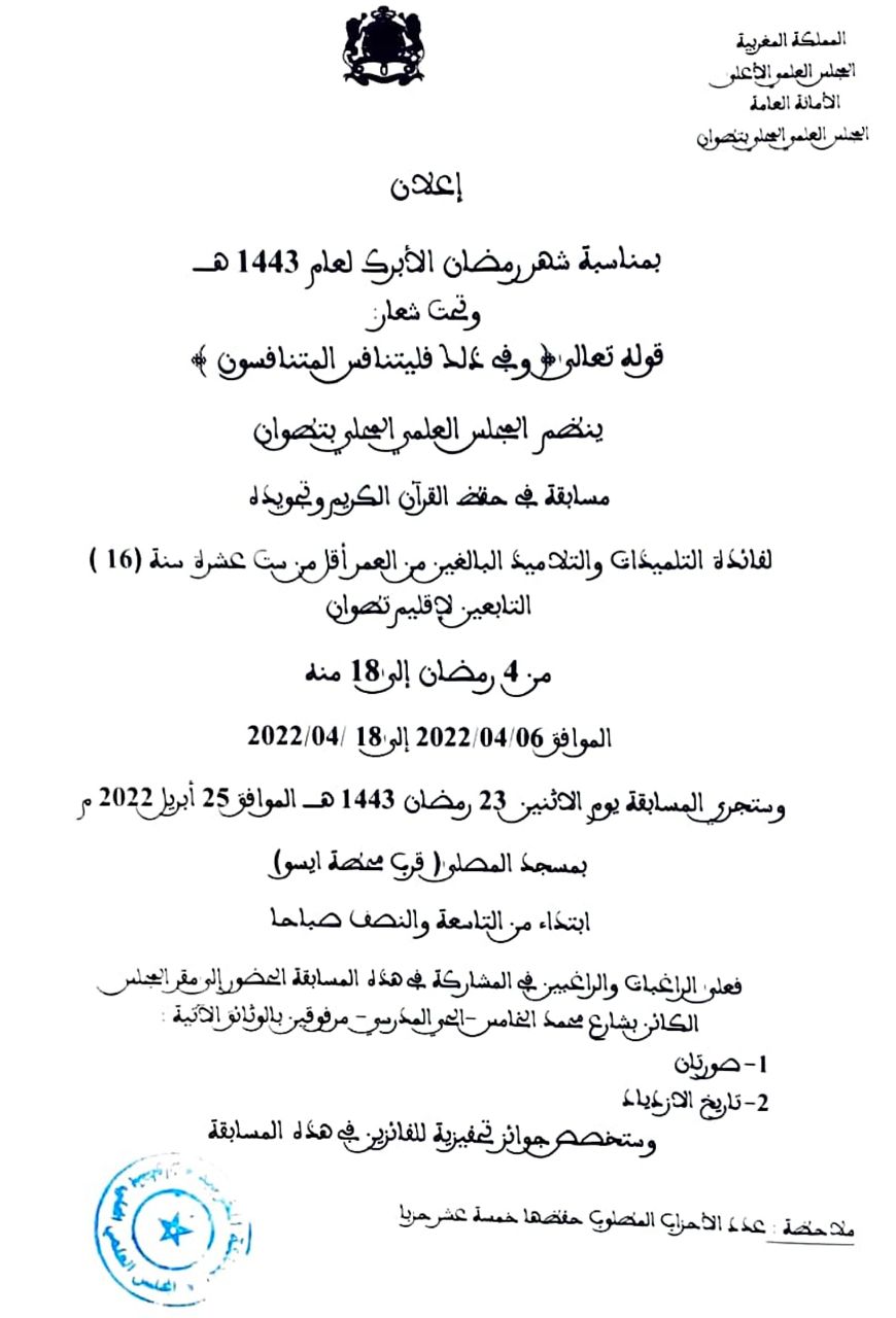أخبار المجلس العلميأنشطة المجلس العلمي مسابقة في حفظ القرآن الكريم وتجويده بواسطة mohammed said في أبريل 6, 2022 272 شارك 272 شارك FacebookTwitterGoogle+ReddItWhatsAppPinterestالبريد الإلكتروني