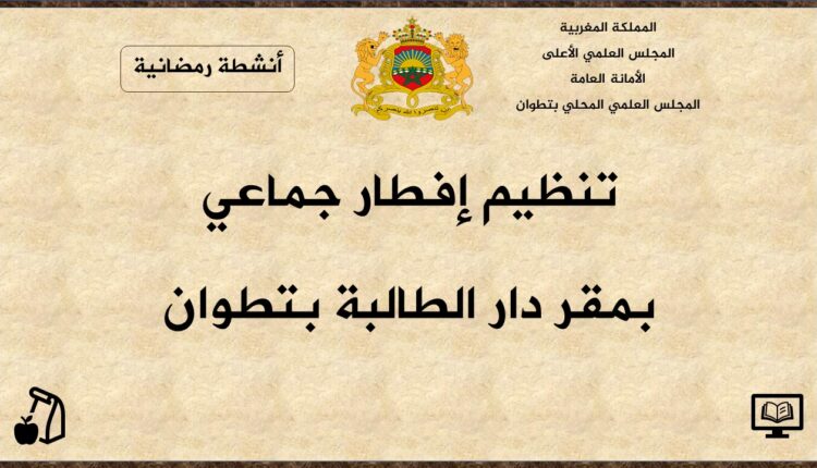 فقد نظم المجلس العلمي المحلي بتطوان بتأطير من مرشدات لجنة العمل الاجتماعي، إفطارا جماعيا بمقر دار الطالبة بتطوان، وقد حضر هذا النشاط كل من فضيلة السيد رئيس المجلس العلمي المحلي الدكتور محمد الشنتوف ومنسقة الخلية النسوية ذة. حسناء داود وكافة مرشدات اللجنة المذكورة.