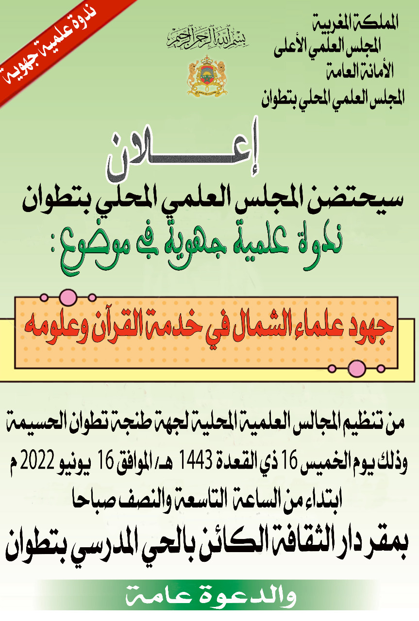 من تنظيم المجالس العلمية المحلية لجهة طنجة تطوان الحسيمة، وذلك يوم الخميس 16 ذي القعدة 1443 الموافق 16 يونيو 2022 ابتداء من التاسعة والنصف صباحا بمقر دار الثقافة بتطوان.