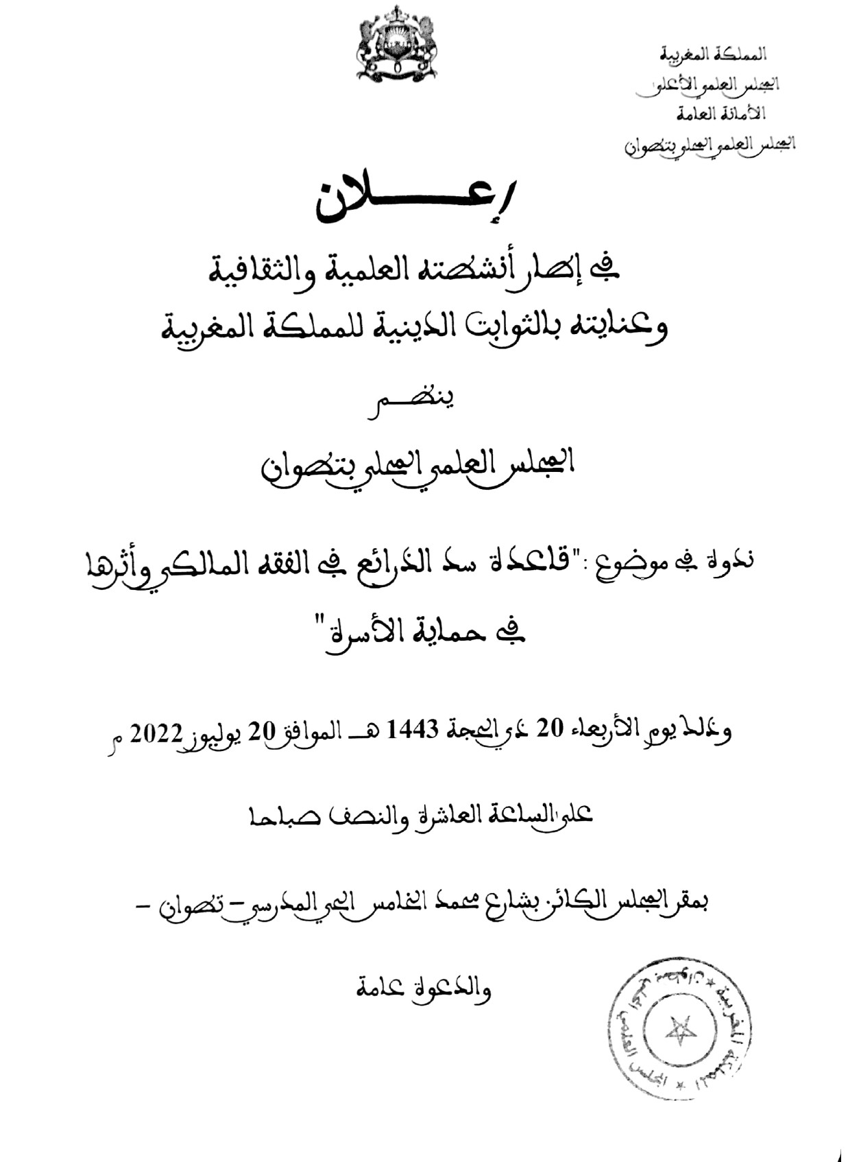 أخبار المجلس العلميأنشطة المجلس العلميلقاءات تواصلية تنظيم ندوة علمية بعنوان: قاعدة سد الذرائع في الفقه المالكي وأثرها في حماية الأسرة بواسطة mohammed said آخر تحديث يوليو 14, 2022 279 شارك 279 شارك FacebookTwitterGoogle+ReddItWhatsAppPinterestالبريد الإلكتروني