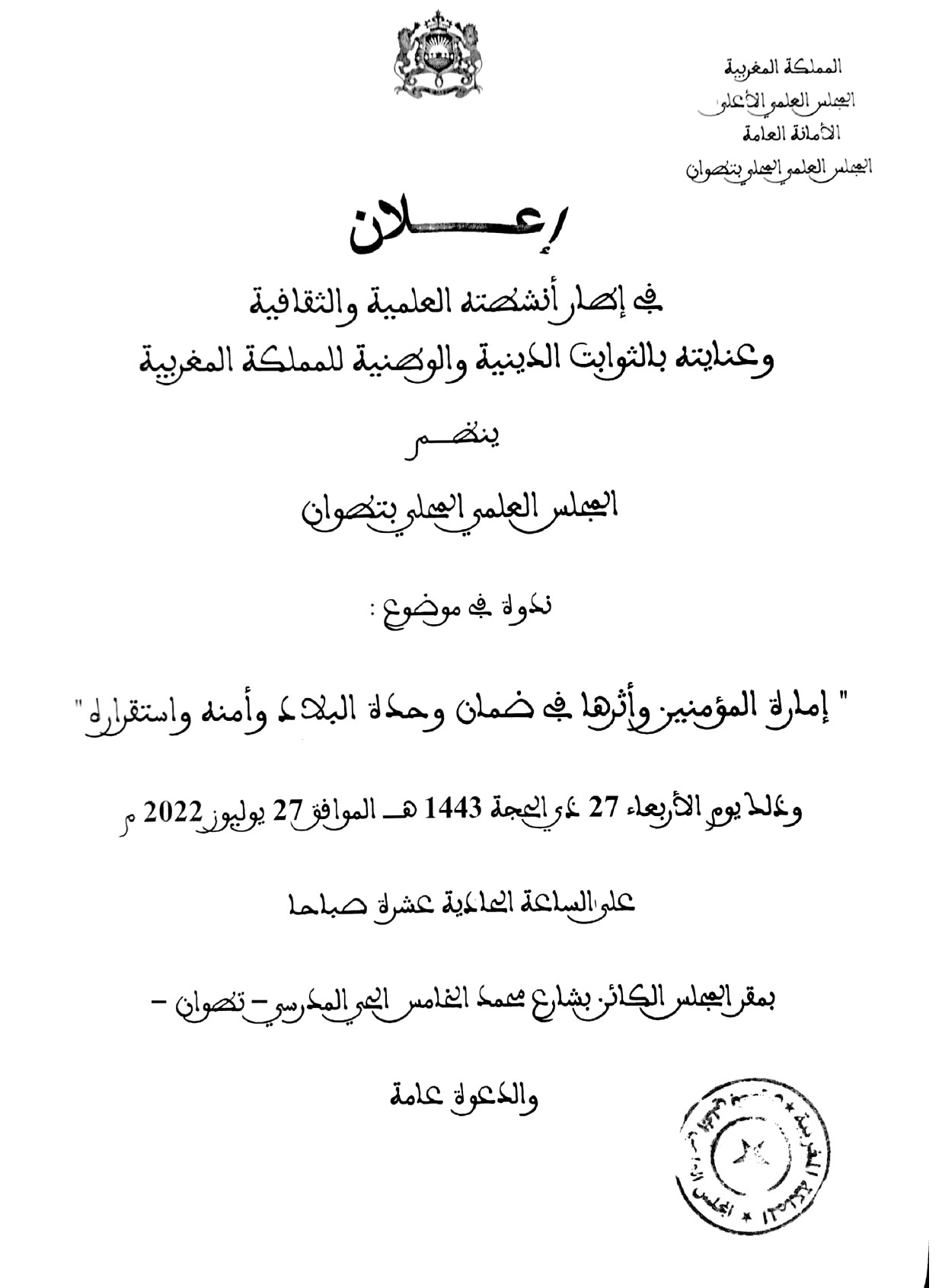 أخبار المجلس العلميأنشطة المجلس العلميلقاءات تواصلية تنظيم ندوة علمية في موضوع: إمارة المومنين وأثرها في ضمان وحدة البلاد وأمنه واستقراره بواسطة mohammed said آخر تحديث يوليو 14, 2022 291 شارك 291 شارك FacebookTwitterGoogle+ReddItWhatsAppPinterestالبريد الإلكتروني