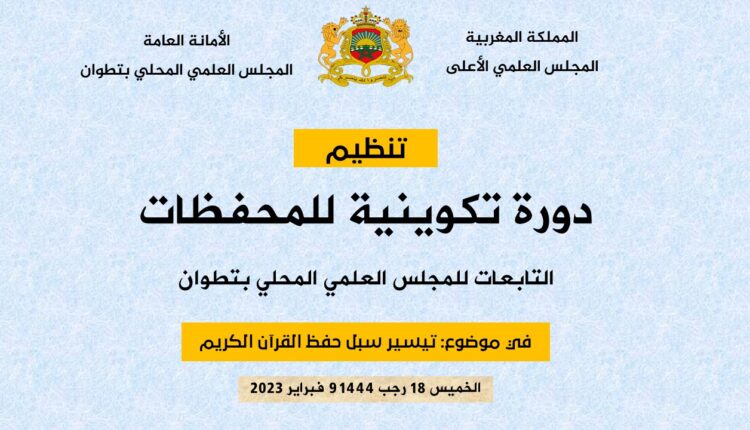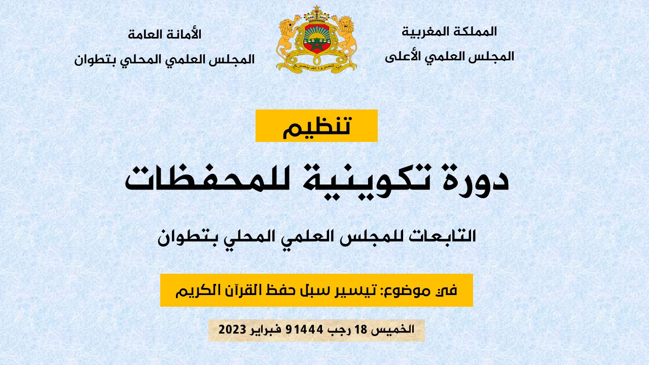 في إطار تواصل المجلس العلمي المحلي لتطوان مع المرشدات الدينيات والمحفظات التابعات له، نظم المجلس العلمي بمقره يومه الخميس 18 رجب 1444 هـ 9 فبراير 2023 م، لقاء تواصليا مع المحفظات المؤطرات لدروس التحفيظ بالمساجد التابعة لنفوذه، وقد تضمن هذا اللقاء دورة تكوينية في موضوع: