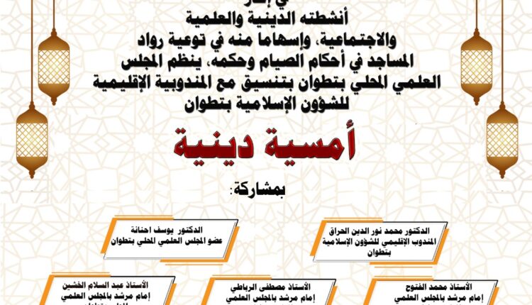 نظم المجلس العلمي المحلي بتطوان بتنسيق مع المندوبية الإقليمية للشؤون الإسلامية بتطوان أمسية دينية يوم الخميس 15 رمضان 1444ه الموافق ل 6 أبريل 2023م بعد صلاة الظهر بمسجد المصلى بتطوان.