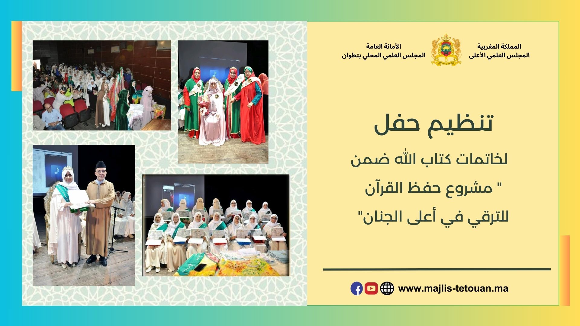 في إطار تنزيله للأنشطة العلمية والتأطيرية والتواصلية والاجتماعية نظم المجلس العلمي المحلي بتطوان حفلا لخاتمات كتاب الله ضمن” مشروع حفظ القرآن للترقي في أعلى الجنان” الذي تشرف عليه المرشدة ليلى البرودي موحمد وذلك يوم الخميس 3 ربيع الثاني 1445ه/ 19 أكتوبر 2023م على الساعة 4 مساء في المركز الثقافي (دار الثقافة) بتطوان.