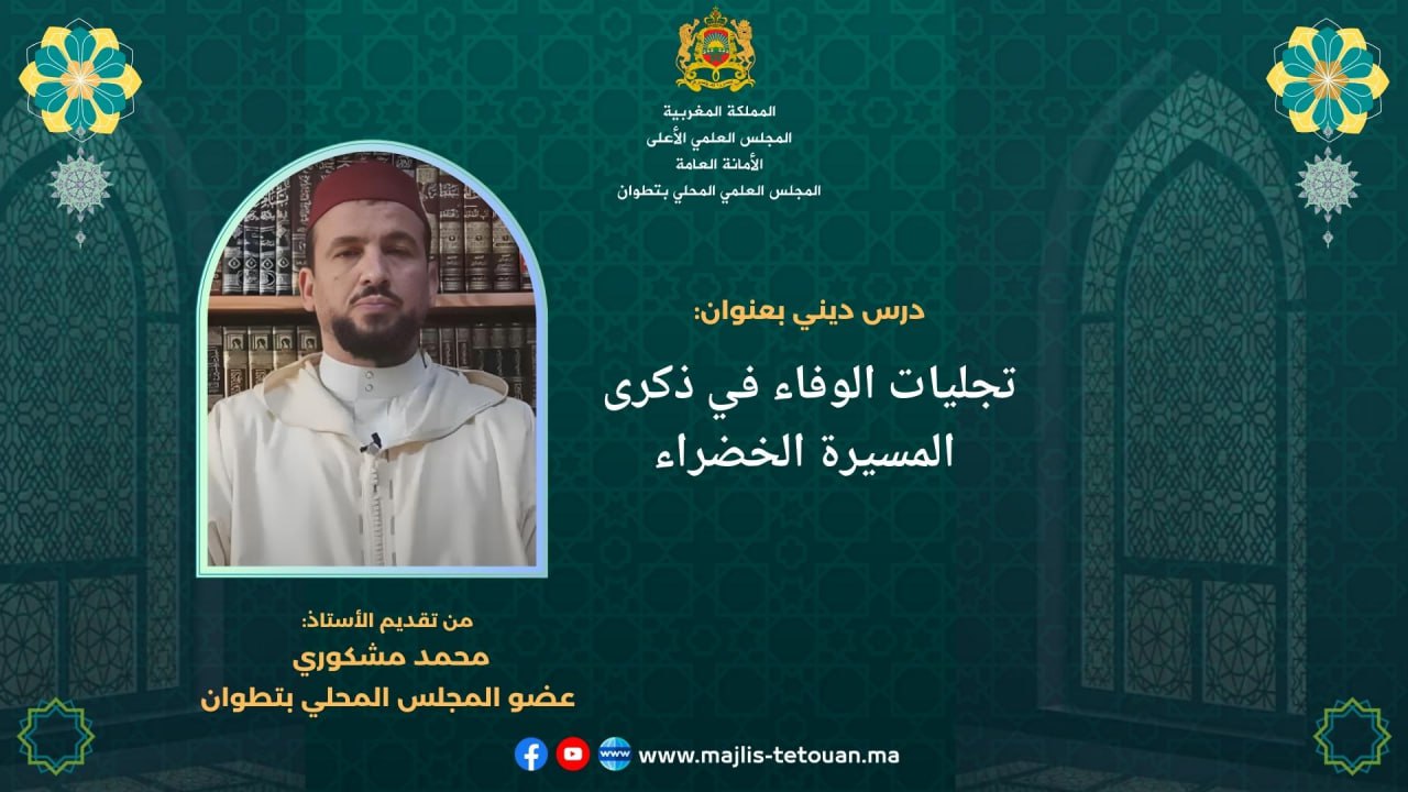 أخبار المجلس العلميأنشطة المجلس العلميدروس في الوعظ والإرشاد تجليات الوفاء في ذكرى المسيرة الخضراء (درس ديني) بواسطة mohammed said في نوفمبر 28, 2023 0 411 شارك في إطار أنشطته العلمية والثقافية يقدم المجلس العلمي المحلي بتطوان درسا بعنوان: تجليات الوفاء في ذكرى المسيرة الخضراء من تقديم الأستاذ: محمد مشكوري عضو المجلس العلمي المحلي بتطوان 0 411 شارك FacebookTwitterGoogle+ReddItWhatsAppPinterestالبريد الإلكتروني