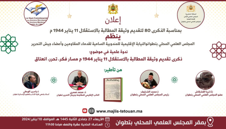 في إطار تنزيله لبرنامج أنشطته العلمية والثقافية،وفي سياق عنايته بالذكريات الوطنية الخالدة واستخلاص الدروس والعبر منها. وبمناسبة الذكرى 80 لتقديم وثيقة المطالبة بالإستقلال 11 يناير 1944م. نظم المجلس العلمي المحلي بتطوان بالتنسيق مع النيابة الإقليمية للمندوبية السامية لقدماء المقاومين وأعضاء جيش التحرير، ندوة علمية في موضوع: