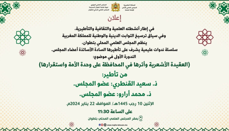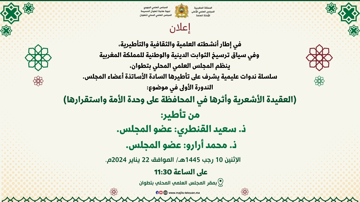 في إطار أنشطته العلمية والثقافية والتأطيرية، وفي سياق ترسيخ الثوابت الدينية والوطنية للمملكة المغربية الشريفة، نظم المجلس العلمي المحلي بتطوان، يوم الاثنين 10 رجب 1445هـ/ الموافق 22 يناير 2024م، بمقر المجلس العلمي.