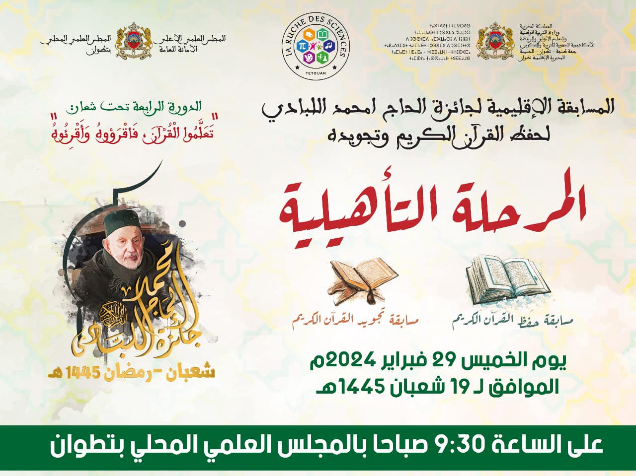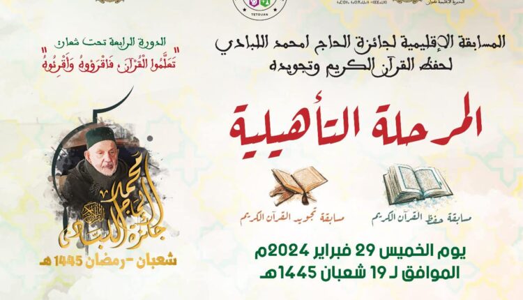 في إطار تنزيله لبرنامج أنشطته العلمية والثقافية، وفي سياق عنايته بالقرآن الكريم، وإسهامه في تشجيع الناشئة على الاهتمام بالقرآن الكريم وانفتاحه على محيطه الخارجي، أشرف ا #المجلس_العلمي_المحلي_بتطوان يوم الخميس 27 فبراير 2024م، على الإقصائيات التأهيلية لجائزة #الحاج_امحمد_اللبادي رحمه الله لحفظ القرآن الكريم وتجويده، في دورتها الرابعة، المنظمة من طرف مؤسسة Ecole La Ruche des Sciences – Tétouan بتنسيق مع المجلس العلمي المحلي بتطوان، والمديرية الإقليمية لوزارة التربية الوطنية والتعليم الأولي والرياضة بتطوان تحت شعار: