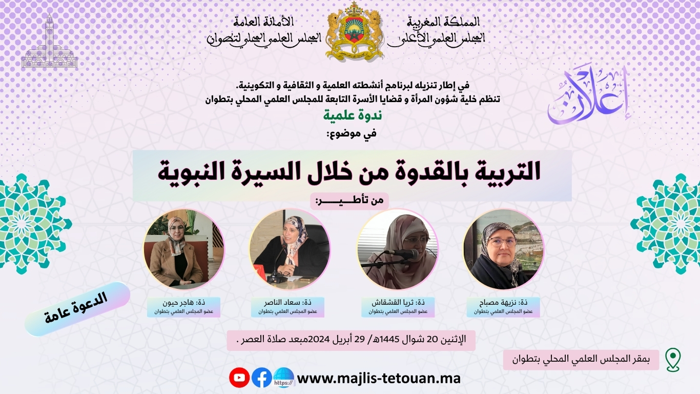 نظمت خلية شؤون المرأة وقضايا الأسرة التابعة للمجلس العلمي المحلي بتطوان ندوة علمية بمقر المجلس العلمي بعد صلاة العصر .
