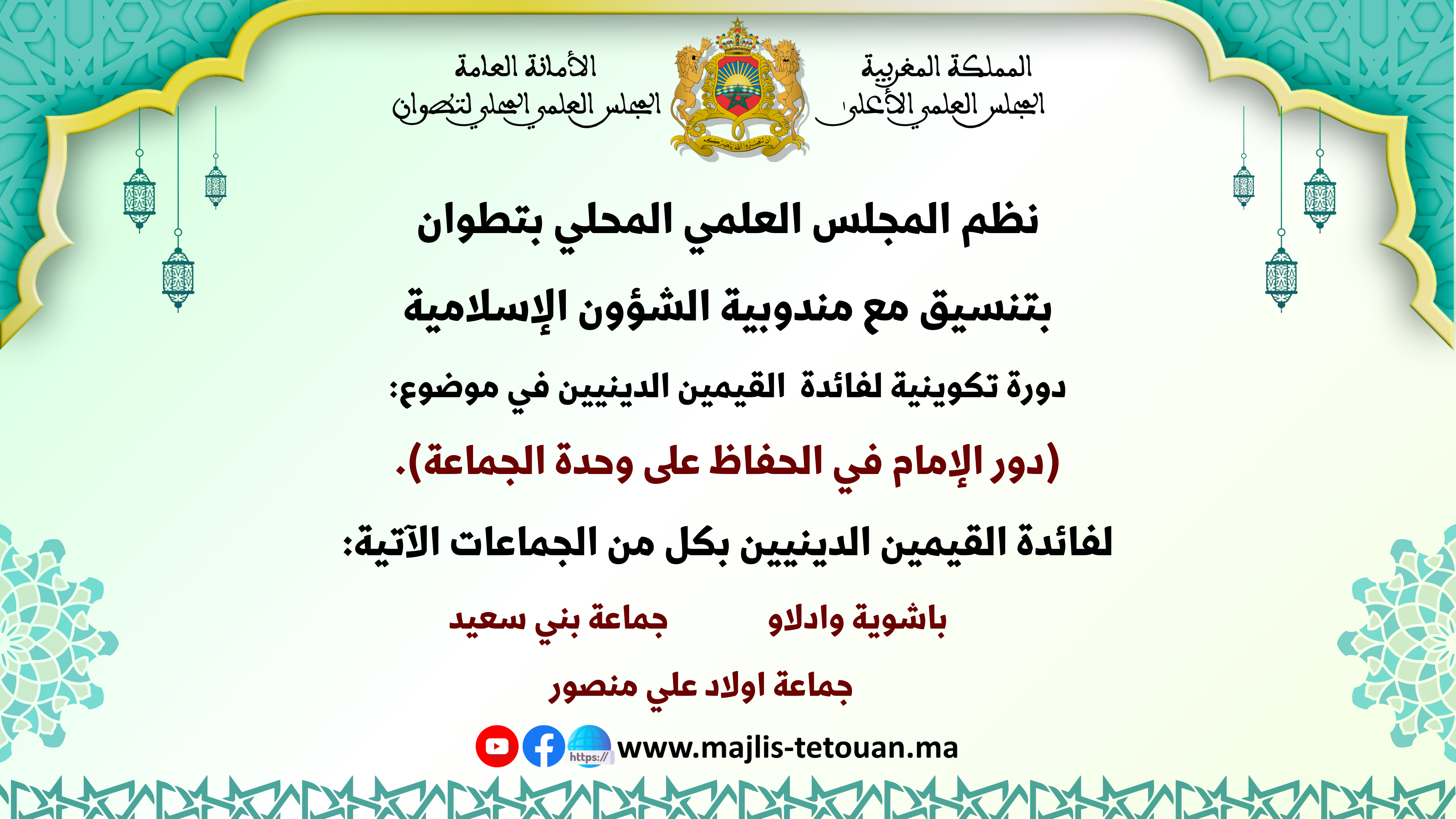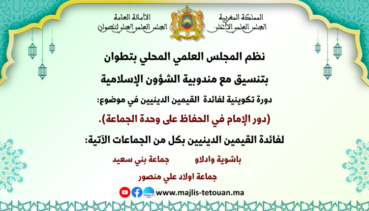 في إطار تنزيله لبرنامج أنشطته العلمية والثقافية والتكوينية والتواصلية، وفي سياق مواكبة تنزيل خطة تسديد التبليغ، وإسهاما منه في التكوين المستمر للقيمين الدينيين، نظم المجلس العلمي المحلي بتطوان بتنسيق مع المندوبية الإقليمية للشؤون الإسلامية بتطوان، دورة تكوينية لفائدة القيمين الدينيين في موضوع: