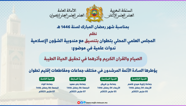 في إطار تنزيله لبرنامج أنشطته العلمية والثقافية والتواصلية، ومواكبته لخطة تسديد التبليغ، نظم المجلس العلمي المحلي بتطوان بتنسيق مع المندوبية الإقليمية للشؤون الإسلامية بتطوان، عددا من الندوات العلمية في موضوع: “الصيام والقرآن الكريم وأثرهما في تحقيق الحياة الطيبة”، أطرها السادة الأئمة المرشدون: