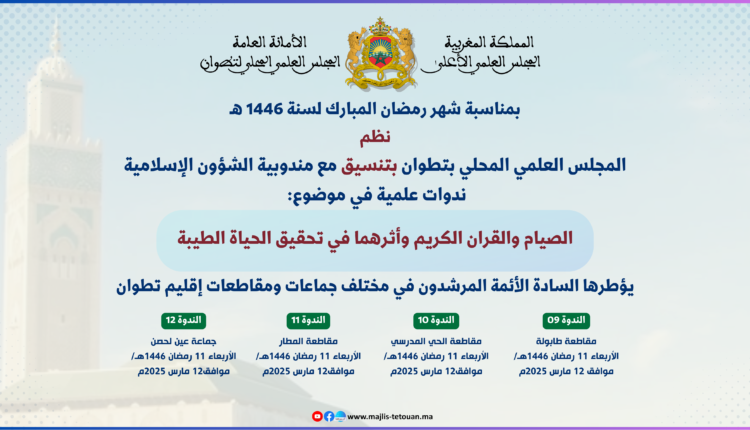 في إطار تنزيله لبرنامج أنشطته العلمية والثقافية والتواصلية، ومواكبته لخطة تسديد التبليغ، نظم المجلس العلمي المحلي بتطوان بتنسيق مع المندوبية الإقليمية للشؤون الإسلامية بتطوان، عددا من الندوات العلمية في موضوع: “الصيام والقرآن الكريم وأثرهما في تحقيق الحياة الطيبة”، أطرها السادة الأئمة المرشدون: