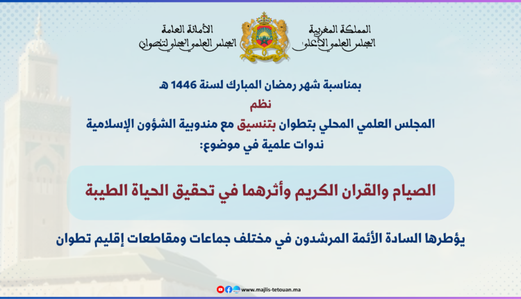 في إطار تنزيله لبرنامج أنشطته العلمية والثقافية والتواصلية، ومواكبته لخطة تسديد التبليغ، نظم المجلس العلمي المحلي بتطوان بتنسيق مع المندوبية الإقليمية للشؤون الإسلامية بتطوان، عددا من الندوات العلمية في موضوع: “الصيام والقرآن الكريم وأثرهما في تحقيق الحياة الطيبة”، أطرها السادة الأئمة المرشدون: