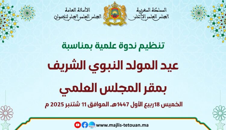 في إطار تنزيله لبرنامج أنشطته الدينية والعلمية والثقافية والتكوينية، واحتفالا بعيد المولد النبوي الشريف، نظم المجلس العلمي المحلي بتطوان، يوم الخميس 18 ربيع الأول 1447هـ، موافق 11 شتنبر 2025م، ندوة علمية في موضوع: