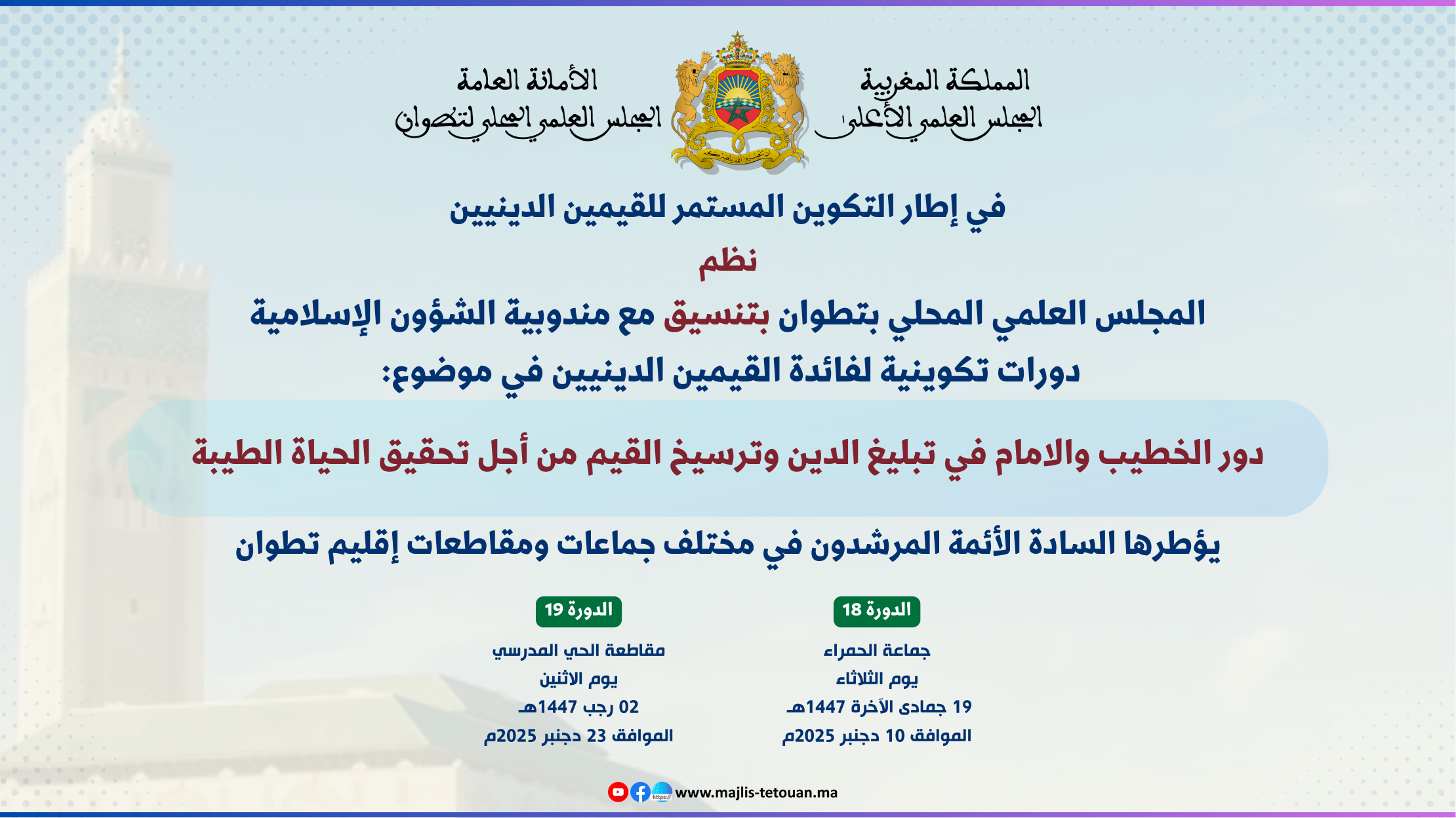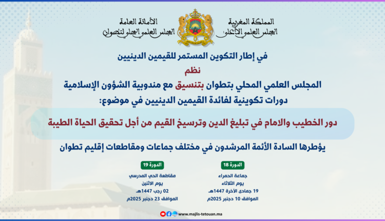 في إطار الأنشطة العلمية والثقافية والتواصلية، للمجلس العلمي المحلي بتطوان، وتنزيلاً لمقتضيات (خطة تسديد التبليغ)، نظم المجلس العلمي المحلي بتطوان، وبتنسيق مع المندوبية الإقليمية للشؤون الإسلامية بتطوان؛ دورتين تكوينيتين في موضوع: “دور الإمام والخطيب في تبليغ الدين وترسيخ القيم؛ لتحقيق الحياة الطيبة”، أشرف على تأطيرها السادة الأئمة المرشدون: