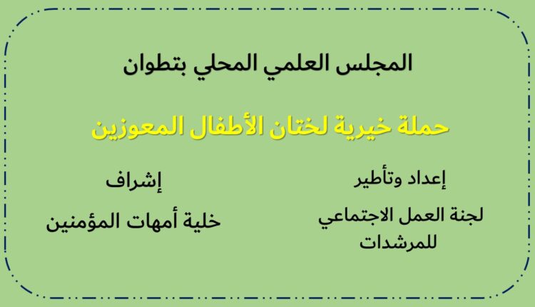 فبمناسبة ذكرى المولد النبوي الشريف، وفي إطار الأنشطة الدينية والاجتماعية والثقافية التي ينظمها المجلس العلمي المحلي بتطوان، وبتنسيق مع خلية أمهات المؤمنين، قامت لجنة العمل الاجتماعي الخاصة بالمرشدات بالمجلس العلمي المحلي بتطوان، بتأطير عملية الختان الجماعية لفائدة 22 طفلا من الأسر المعوزة بالمدينة والقرى المجاورة، بمساهمة عدد من المحسنين.